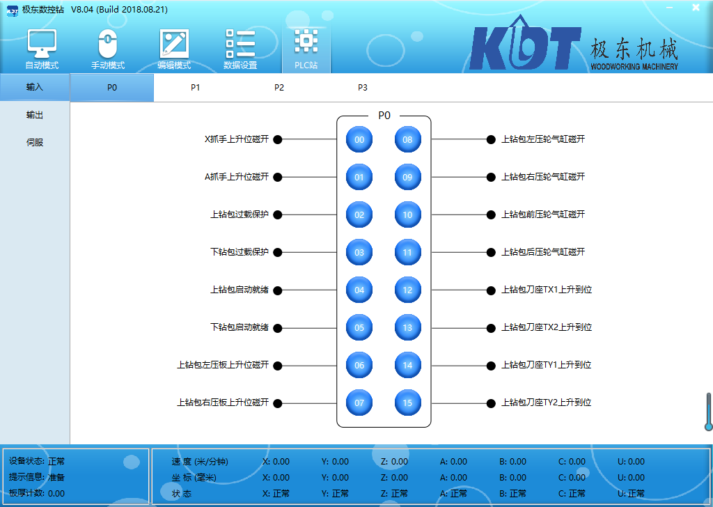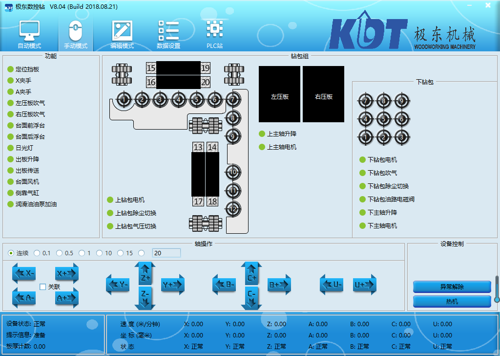 可以手动控制机器的各个功能,比如外部输出,钻头/压板/压轮升降,轴的运动等。
