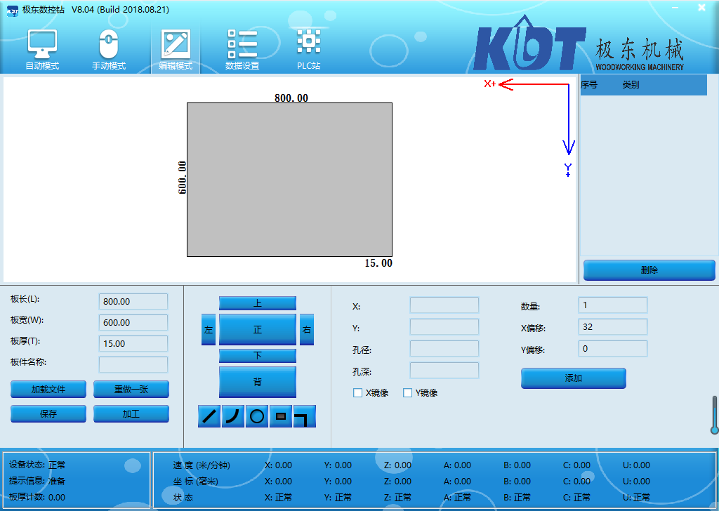 编辑加工的板件,面板长宽厚尺寸,添加孔位信息,添加直槽,弧,圆,矩形,路径等。